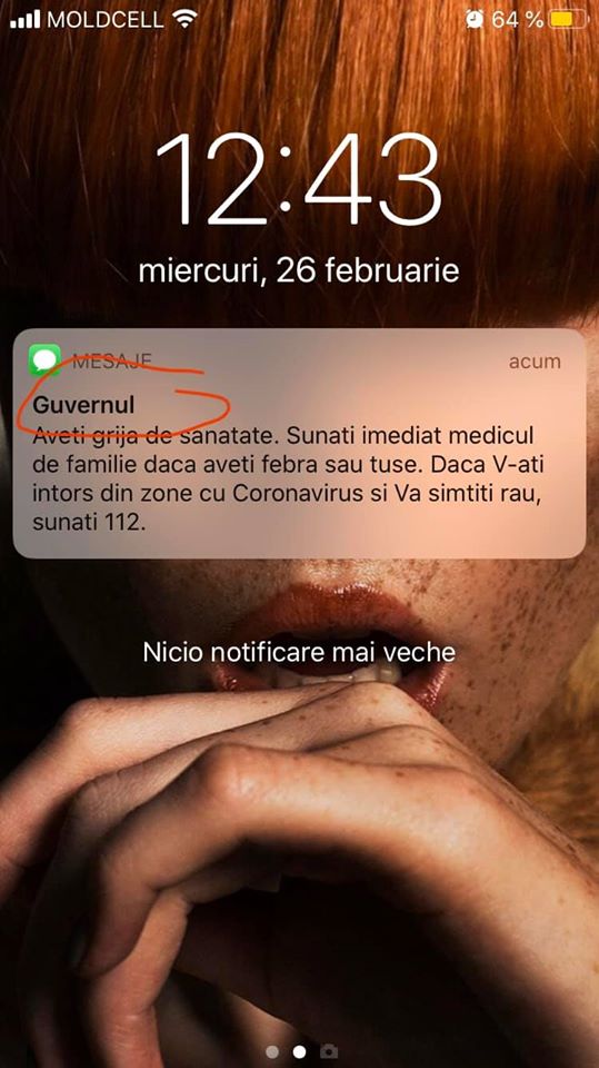 Все граждане Республики Молдова получили сообщение на телефон от правительства. В этом сообщении даны рекомендации и меры профилактики в случае, если вы подозреваете, что у вас Коронавирус.