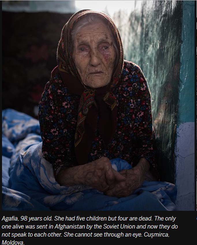 «Сельская Молдова. В этих селах нет водопровода и санитарных блоков, воду нужно носить из колодцев. Зимой температура воздуха здесь может опускаться до -20°C, а дома до сих пор отапливают дровами. Многие из этих людей живут в полном одиночестве и изоляции, а их пенсии составляют менее 60 евро. Единственным человеком, которого я встречал в течение недели, был социальный работник из местного НПО, который приезжал, чтобы помочь старикам с повседневной работой один или два раза в неделю.