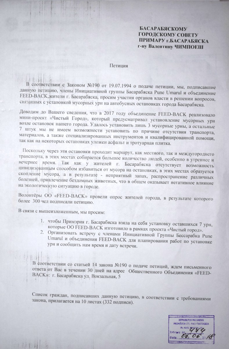 Молодые люди собрали в поддержку своей инициативы более 300 подписей и составили петицию, в которой обратились к Примару г.Басарабяска и Городскому Совету за помощью.