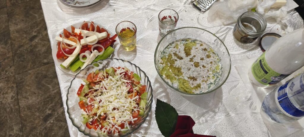 Юрий Иванович рассказывает о шопской салате так, как о блюде, которое спасает в любой ситуации: когда нужно быстро, просто и вкусно. Огурцы, помидоры, перец — или, как говорят болгары, чушка, — немного лука, масла, уксуса и щедрая щепотка брынзы, известной у болгар как сирене. В упрощённом варианте — крупные кусочки, в классическом — мелкое нарезание всех ингредиентов и белая «шуба» из натёртой брынзы сверху. А ещё — маленькие секреты от хозяина: «Если хотите удивить — добавьте яблочко».