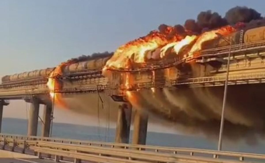 На Крымскому мосту утром 8 октября произошел взрыв, приведший к полной остановке движения по нему. По официальной версии «Крымских железных дорог», причиной происшествия стало возгорание топливной цистерны в хвосте грузового поезда.