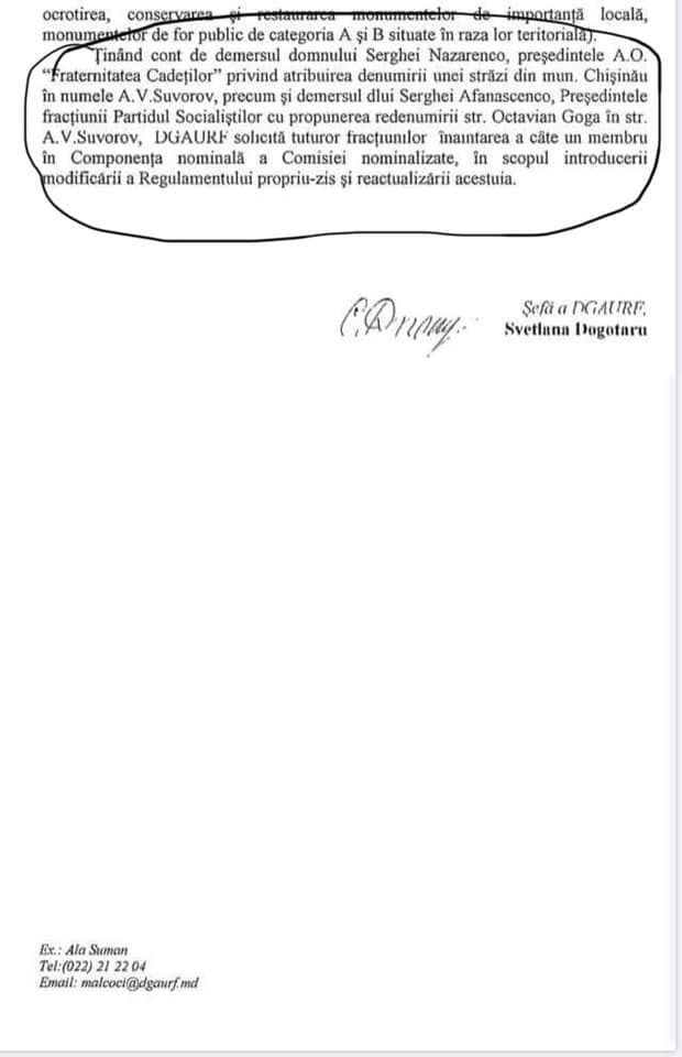 «Социалисты, обращаясь к общественной Ассоциации «Братство кадетов» во главе с Сергеем Назаренко, ассоциацией, целью которой является продвижение интересов национальных меньшинств, а также обращение председателя фракции социалистов муниципальный совет Кишинева (МСК) Сергея Афанасченко, ни много ни мало, требуют переименования улицы Октавиана Гоги В А. В. Суворова!»,- говорится в пресс-релизе.
