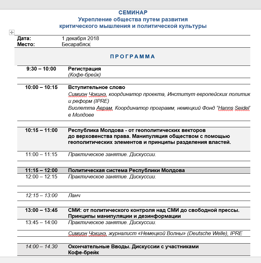 Отобранные участники примут участие в однодневном семинаре в области развития критического мышления и политической культуры, который пройдет в 1 декабря 2018 года в Бессарабке.
