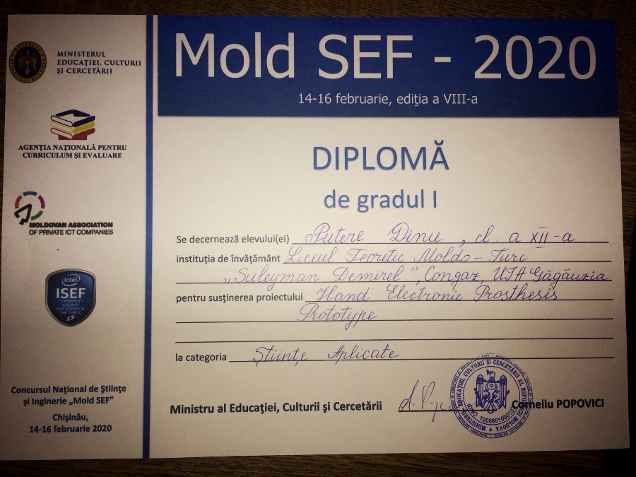 Ученик 12-го класса Конгазского молдо-турецкого лицея им. С. Демиреля Дину ПУТЕРЕ занял I место в Национальном конкурсе науки и инженерии «Mold-SEF», который состоялся в Кишинев 14-16 февраля 2020 года.