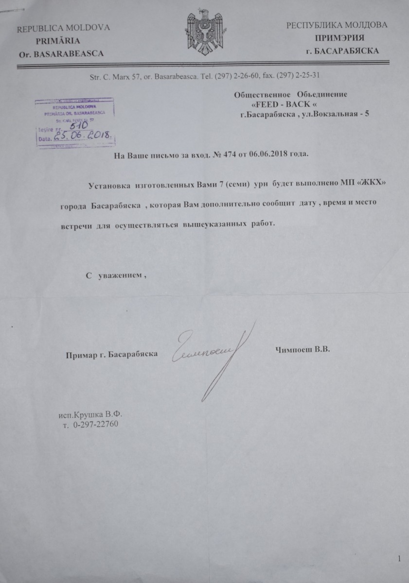 В письме исх.№510 от 25.06.2018 года администрация Примэрии Басарабяска поодтвердила готовность оказать помощь в установке 7 урн на городских остановках силами МП»ЖКХ». О дате и времени проведения работ по установке, городские власти пообещали сообщить дополнительно. С момента получения письма прошло почти три месяца. Волонтеры надеятся на то,что в текущем году, дату, время и место встречи по установке мусорных урн все-таки сообщат, и они, в скором будущем, будут установлены.