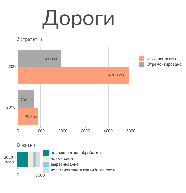 в 2013- 2017 годах, согласно отчету Гоадминистрации автодорог, было отремонтировано чуть более 1000 км дорог. Из них около 600 км, как указано в отчете — «битумная обработка»» (поверхностная обработка дорожных покрытий), 214 км — «новые слои», 190 км — «выравнивание», 216 км — «восстановление гравийного слоя».